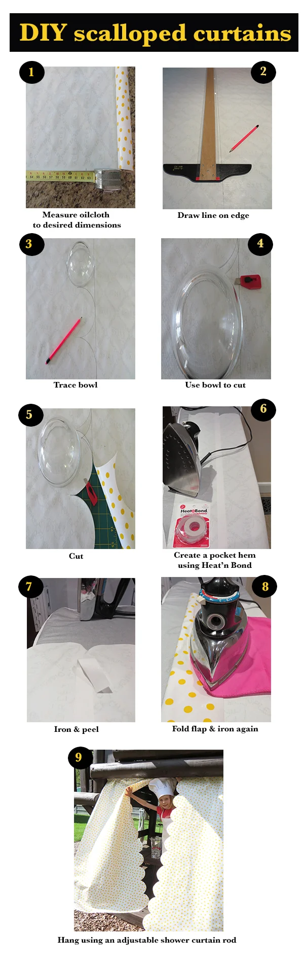 Hi guys, it's me, that girl katie, I am making some headway on the Happy Cafe for my kids and thought I would share my oilcloth DIY scalloped curtains.
